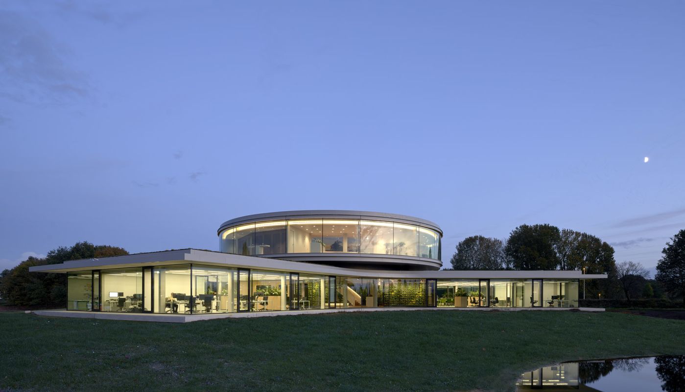 ontworp dit prachtige transparante en duurzame hoofdkantoor dat naadloos overgaat in de zorgvuldig aangelegde natuurlijke omgeving van het landgoed. Centraal in het ontwerp staan een stressvrije omgeving, aangenaam binnenklimaat en vooral het welzijn van de medewerkers.