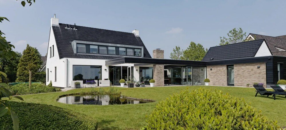 Het zicht is meer op de tuin gericht, waar we met een dikke gevelband en een buitenhaard het terras hebben gekaderd, en op de achterliggende weilanden.