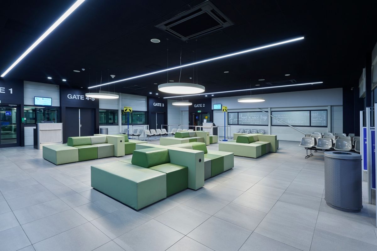 De verlichting ondersteunt de verschillende zones die ieder hun eigen ritme en sfeer uitstralen. Grote laag hangende pendelverlichting met warm licht in de wachtruimte, waar huiselijkheid en comfort voorop staat. Terwijl in de loopzones de verlichting de route ondersteunt. Twee lijnen verlichting die over de hele lengte van het vliegveld strekken begeleiden de reiziger van de centrale ingang helemaal tot aan de vertrekhallen.