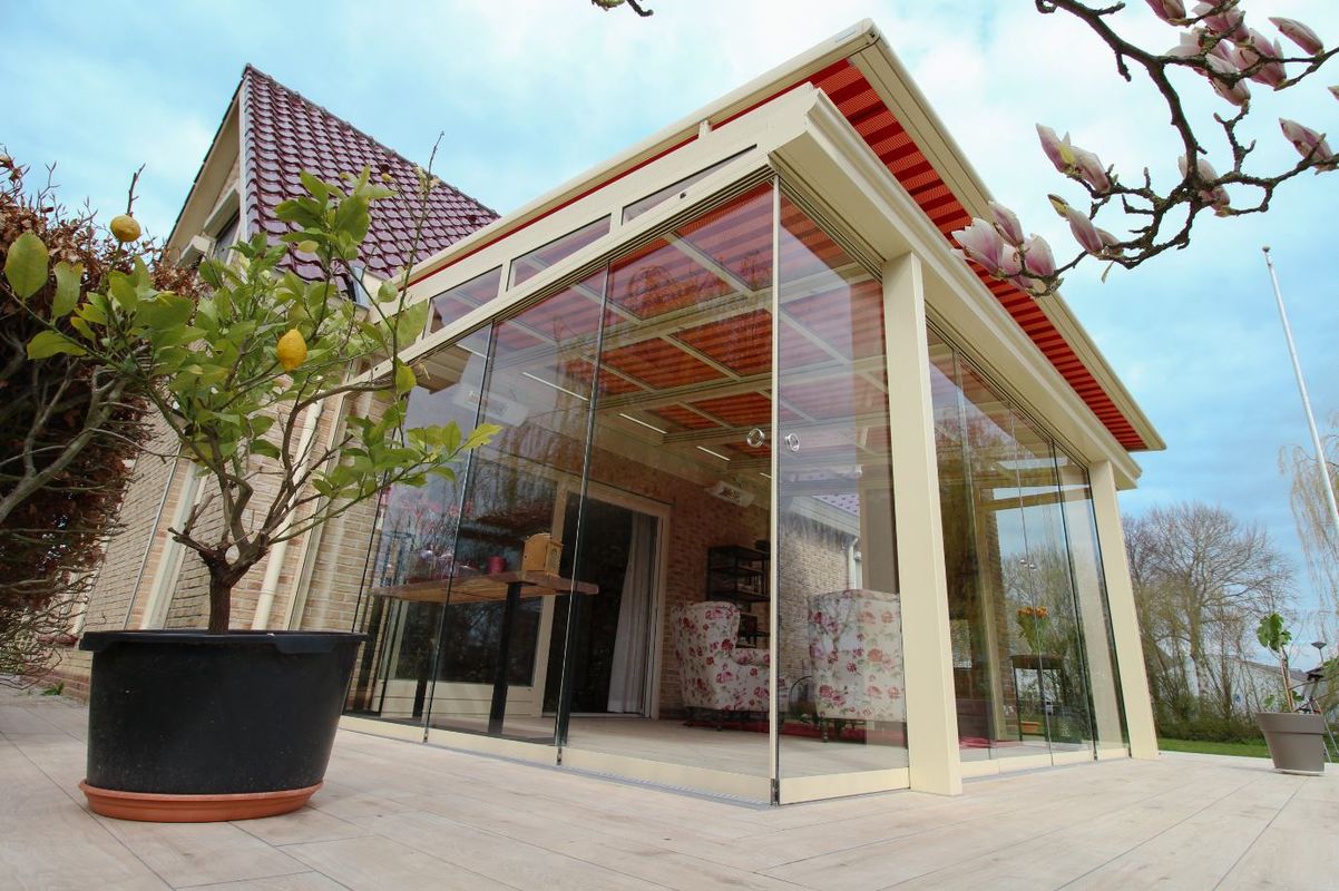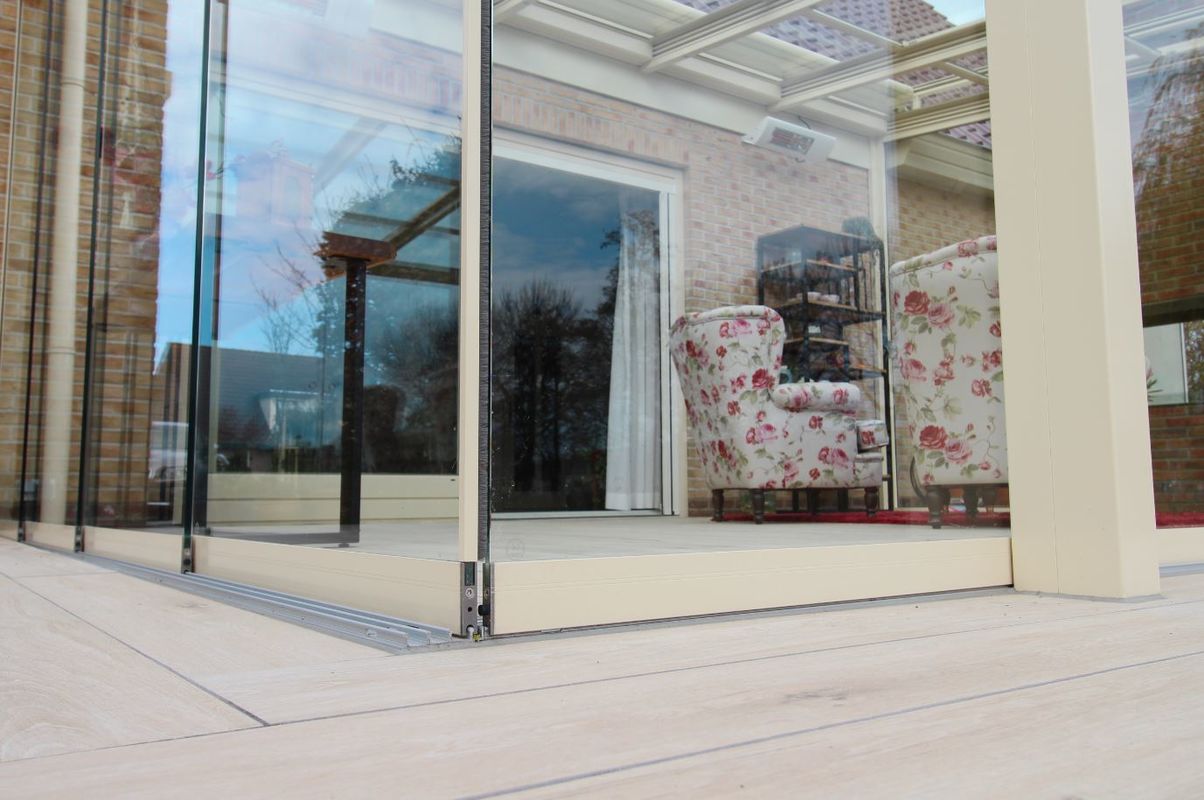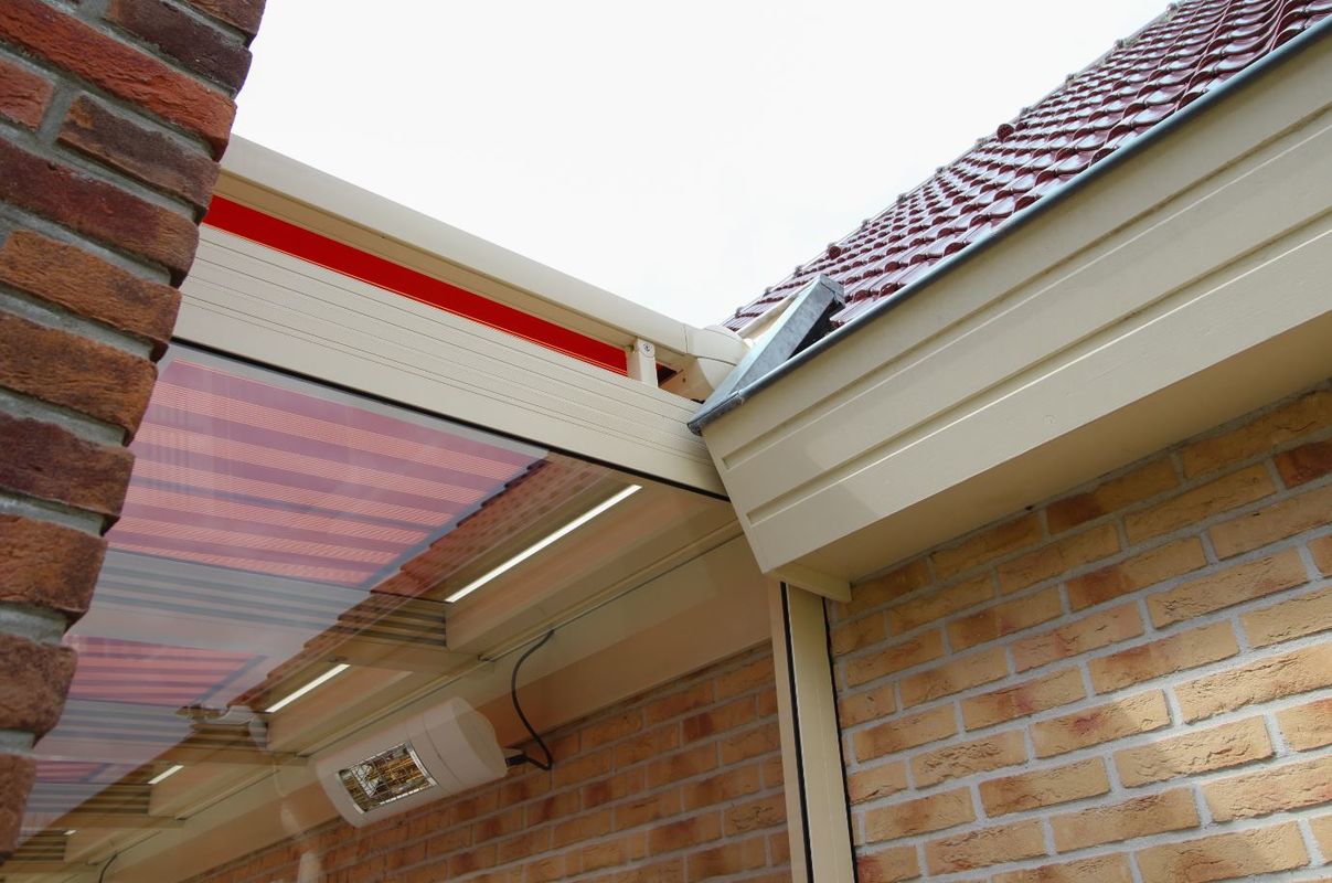 De houtlook tegels, de haard, de heaters en de kleur van de bovenglaszonwering zorgen samen voor een warme ruimte in het naseizoen en in de zomer kan alles open. In de zomer is de tuinkamer flexibel met het schuifdak dat elektrisch bedienbaar open te schuiven is en wanneer het te heet wordt kan de zonwering uit.
