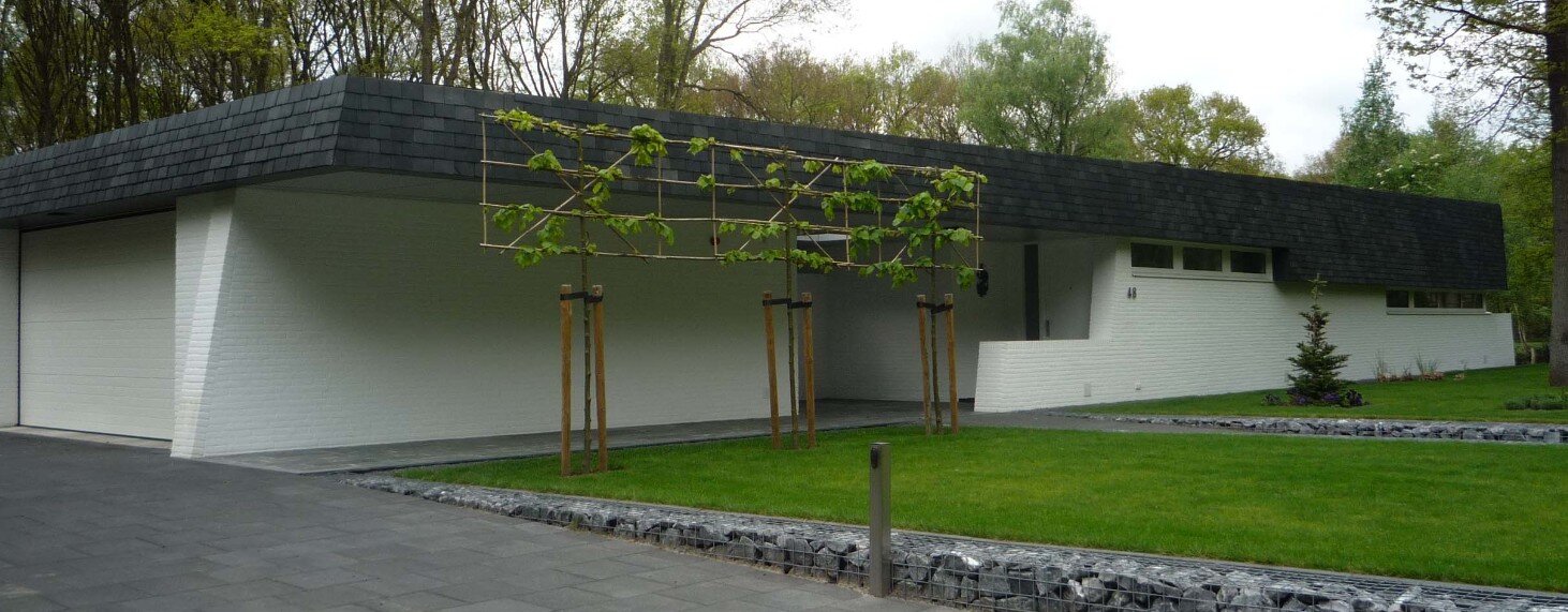 De bijgebouwen en het hoofdgebouw zijn visueel en via een overkapping met elkaar verbonden zodat het een geheel vormt.