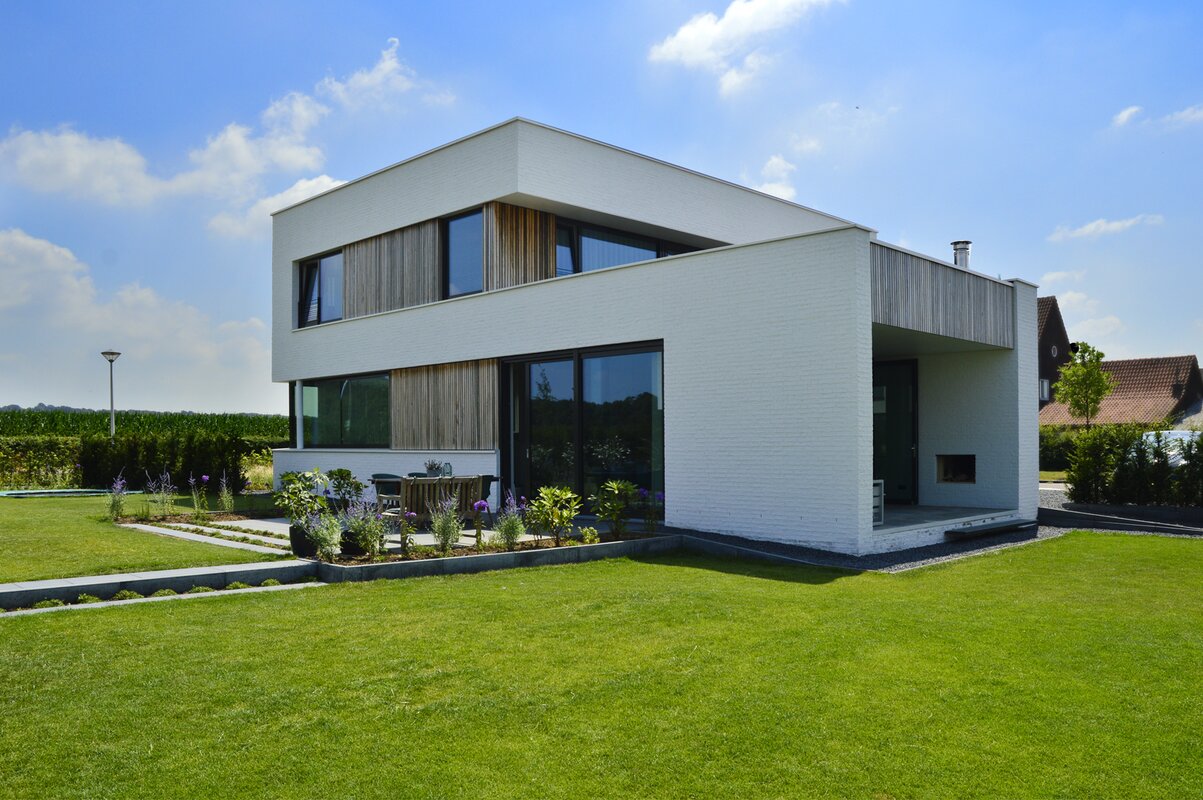 Om nu maximaal van het fantastische uitzicht te kunnen genieten hebben we de woonkamervloer 80 centimeter opgetild zodat de bewoners zittend in hun luie stoel over de beukenhagen heen naar het landschap kijken. Het panoramisch zicht loopt overhoeks door doordat de glazen pui de hoek om is gezet. Deze wordt alleen onderbroken door de haard.