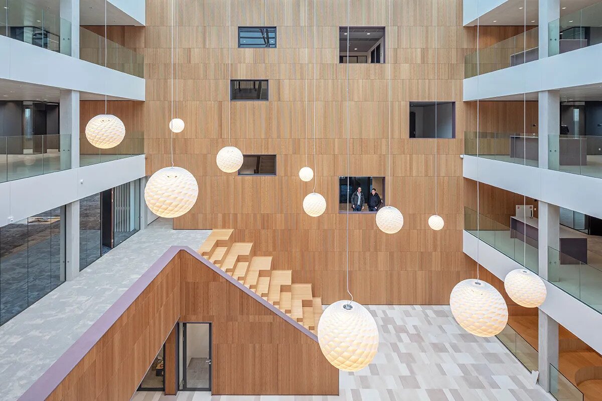 Voor de NVM was het samenbrengen en verbinden van medewerkers en leden een belangrijke wens. Daarom hebben we in het hart van het gebouw een ruim atrium ontworpen; een uitnodigende, open ruimte om samen te komen en samen te werken en tevens een prachtige ontvangstruimte. Om de verbinding en openheid verder te versterken, zijn aan het atrium op elke verdieping open werkzones gecreëerd. De open verbinding tussen de werkplekken en het atrium kan echter ook zorgen voor geluidsoverlast. Hier is in het interieur ontwerp veel aandacht aan besteed. De bijzondere bamboewanden aan weerszijden van het atrium zorgen voor een goede akoestiek, en zijn de eyecatcher van het atrium.