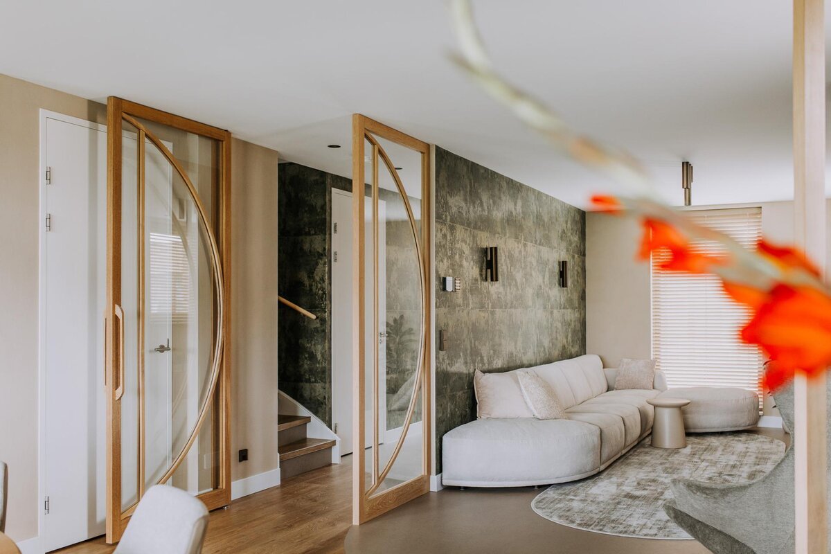 Het lijnenspel van de deur is geen toeval. De woning heeft van nature een hoekige structuur. De interieurontwerper zocht daarom naar manieren om ronde vormen toe te passen en zo de ruimte vriendelijker en meer gebalanceerd te laten aanvoelen.