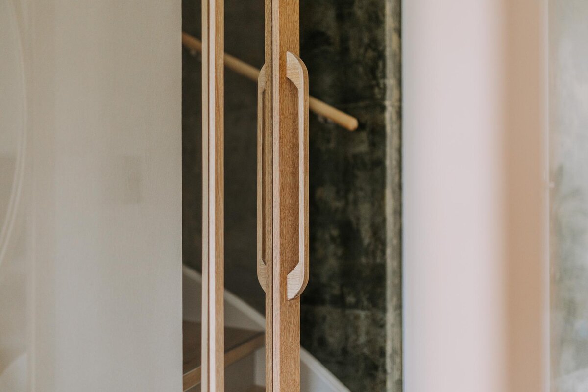 Een speelse golvende overgang in de vloer, van marmoleum naar pvc, loopt subtiel door richting de trap én de deur. Daarom was het essentieel dat de ronde vorm ook terugkwam in het ontwerp van de deur. En dat is precies wat we gedaan hebben: maatwerk tot in het kleinste detail.