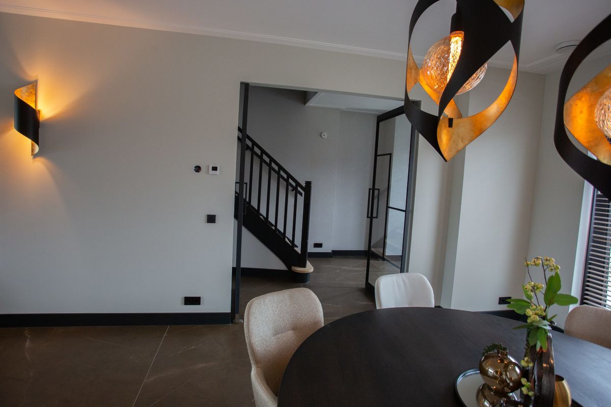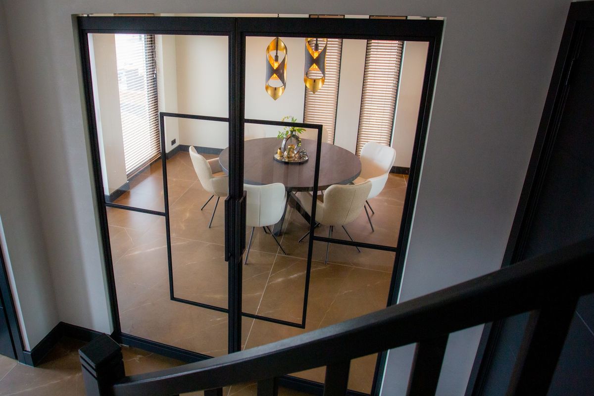 Voor deze riante villa in Volendam mochten wij twee stalen taatsdeuren plaatsen die de woonkamer scheiden van de hal. Het ruimtelijke karakter van de deuren geeft mooie zichtlijnen vanuit de woonkamer naar de prachtige trap. In meerdere opzichten zijn deze taatsdeuren uniek. De taatsdeuren hebben een heel speciaal ontwerp en hele speciale handgrepen die perfect passen bij het elegante ontwerp van de deuren.