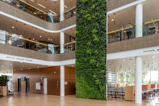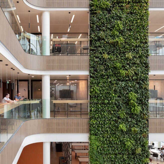 Daarnaast is een voedingsstoffenafgiftesysteem geïntegreerd dat ervoor zorgt dat de planten continu de juiste hoeveelheid nutriënten ontvangen. Deze combinatie van irrigatie, digitale monitoring en gerichte voeding draagt bij aan een stabiel groeiklimaat en een duurzaam beheer van het groen binnen het gebouw.