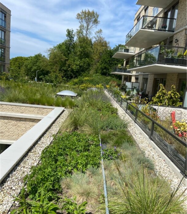 Voor de realisatie van dit project zijn maar liefst 10.000 vaste planten en 80 heesters zorgvuldig in de daktuin, bovenop de parkeergarage, geplant. Dit indrukwekkende aantal planten draagt bij aan de weelderige en weidse uitstraling van het project.