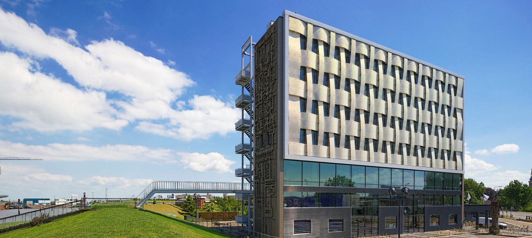 Het Eemsmondgebouw in Delfzijl is onlangs gestript en voorzien van een nieuwe isolerende gevel in de vorm van een vlechtwerk.