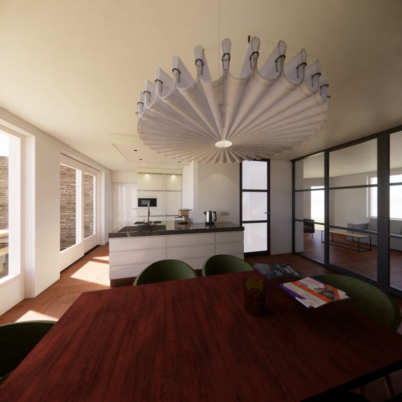 De schuifpui en de toegang naar de bijkeuken blijven hierbij op hun plek. Als afscheiding tussen woonkamer en woonkeuken wordt een schuifpui voorgesteld in de populaire industriële staalprofiel-look. De aangrenzende deur naar de entreehal wordt middels een zelfde deur uitgevoerd om eenheid te creëren. In het kookeiland wordt een kookplaat met kookveldafzuiging en een spoelbak opgenomen. De kleurstelling voor de keuken is nog niet bepaald.