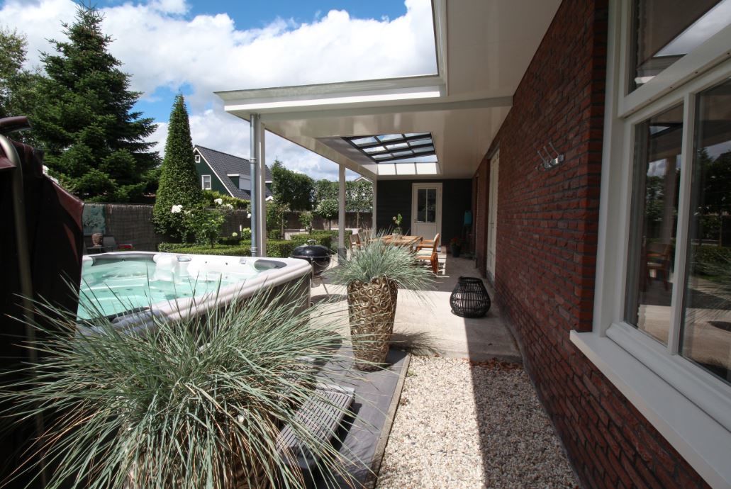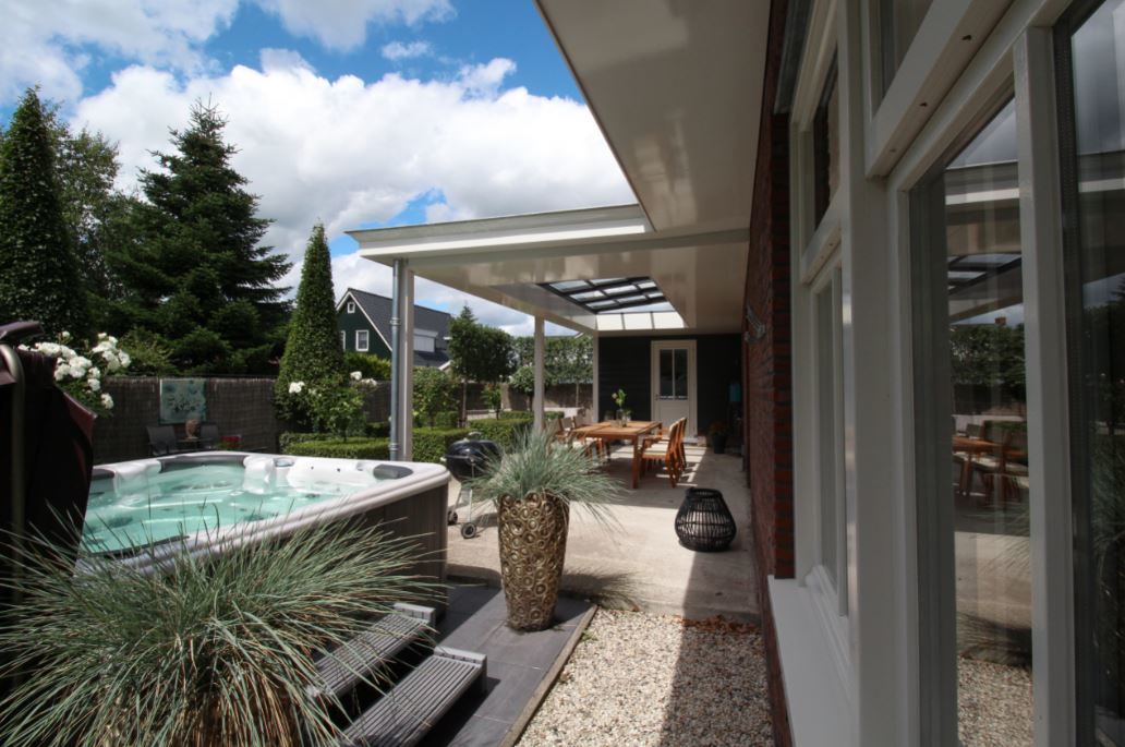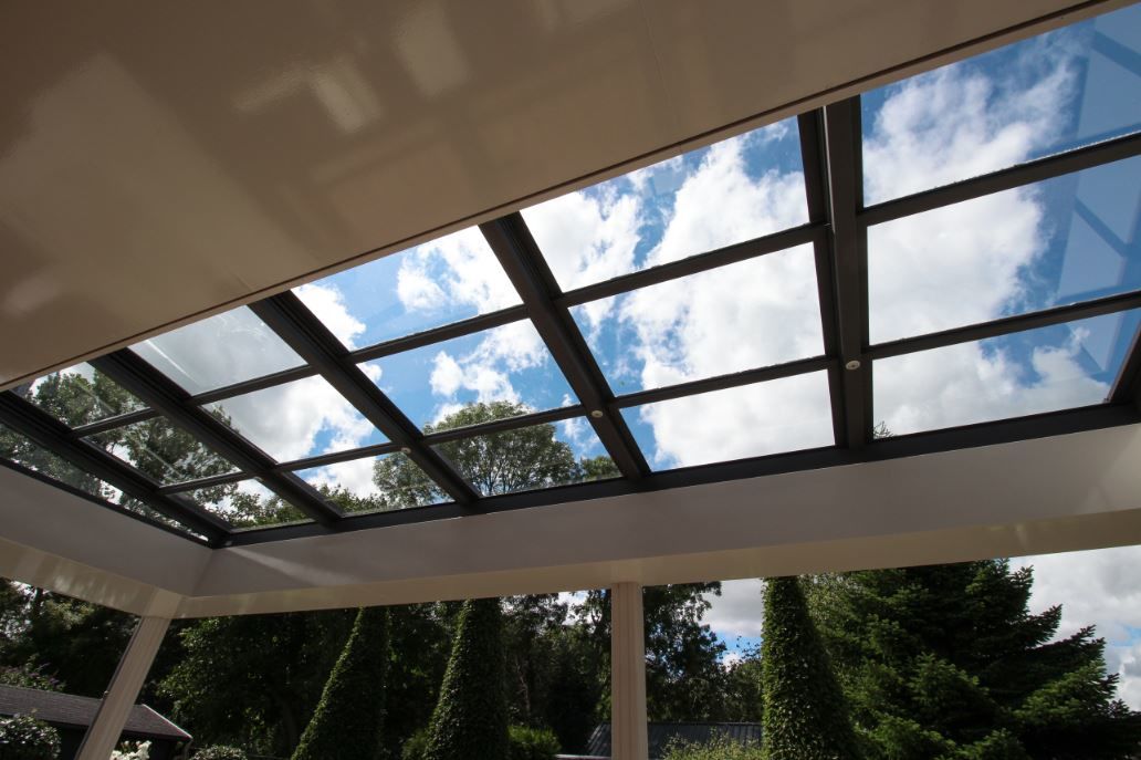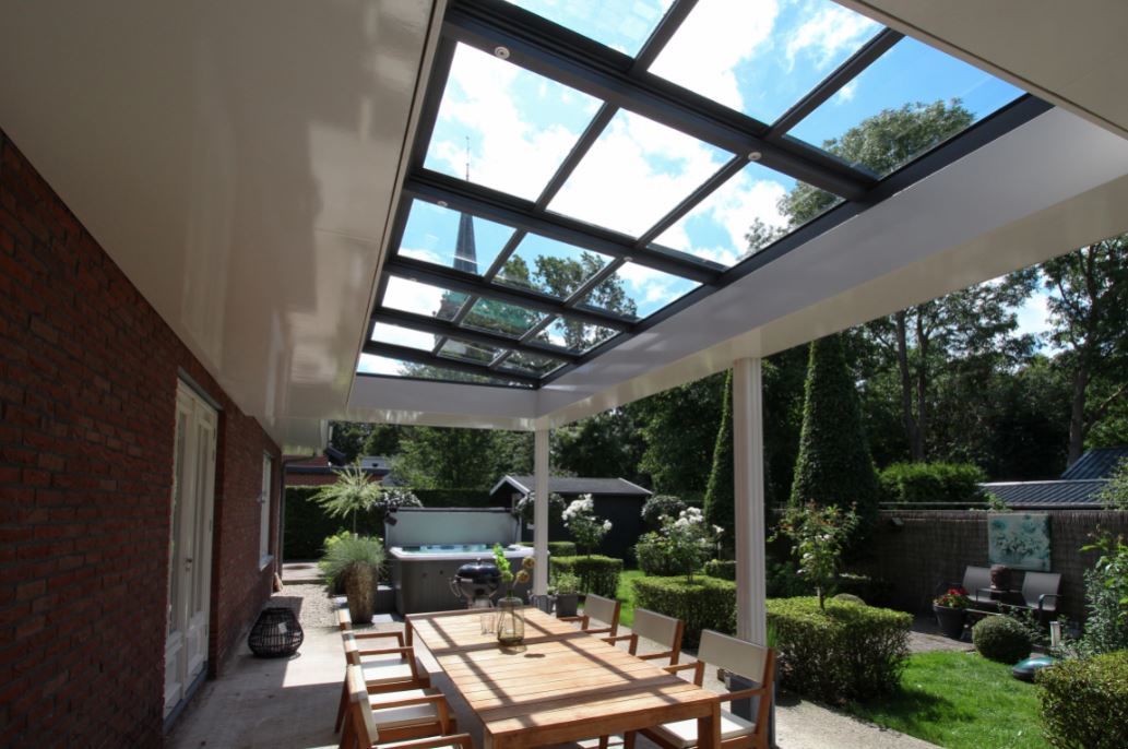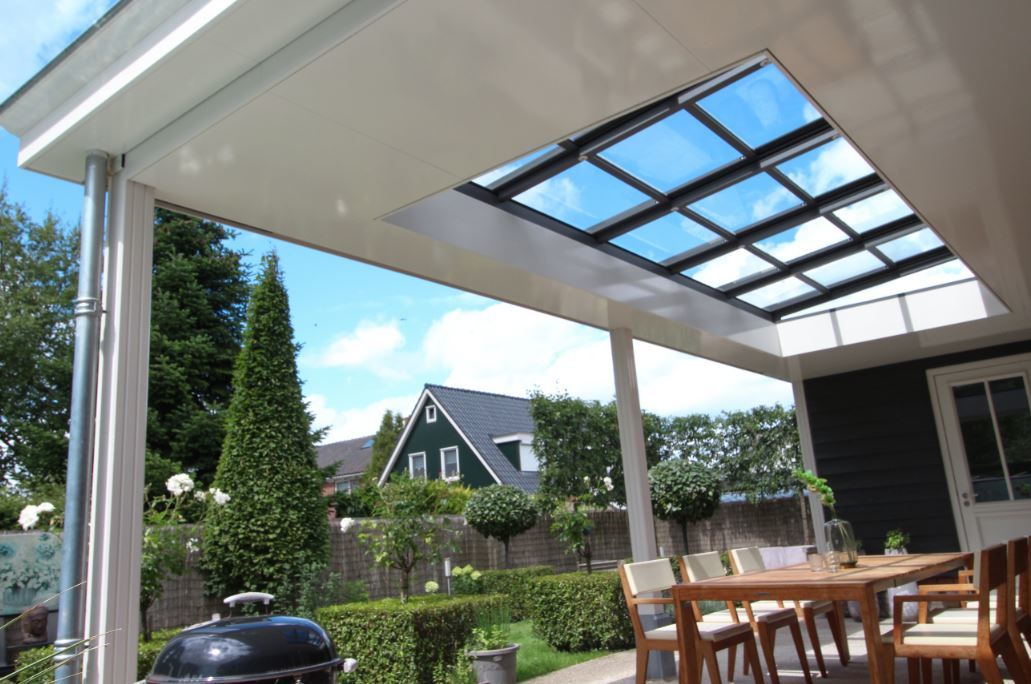 Het platte dak sloot goed aan bij de woning. Daarbij komt kijken dat de witte sierlijke lijst en de goot helemaal om het huis heen lopen, wat zorgt voor één geheel. De tuinkamer is een gave lichtstraat geworden, welke ook nog (elektrisch) open kan. Het schuifdak ligt op vijf graden afloop, zodat het regenwater zonder moeite zijn weg naar de (nog weg te werken) goot kan vinden. De afloop is gecreëerd met een spiekozijn. De volgende stap van het proces is het realiseren van een buitenhaard en de veranda voorzien van wanden. Zo kunnen de bewoners alle seizoenen van deze heerlijke buitenruimte genieten.