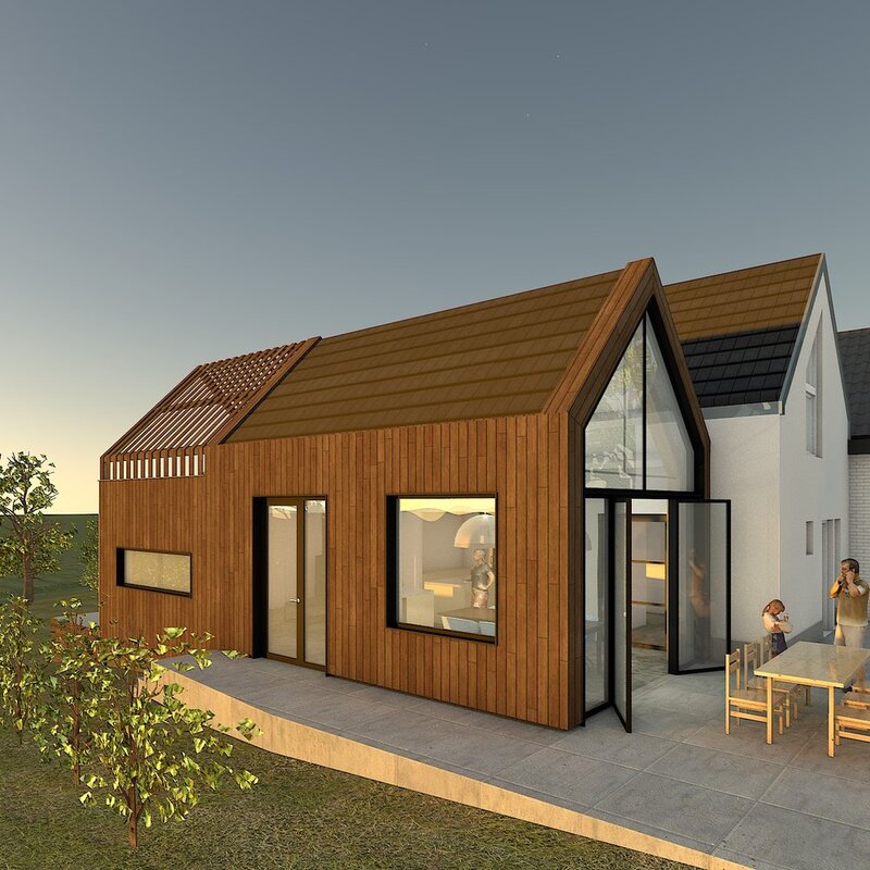 Aan een bestaande woning aan de Rotte, in de buurt van Rotterdam, wordt deze aanbouw gebouwd in de vorm van een