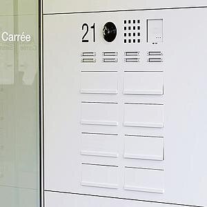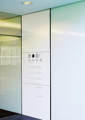 Zo bleef het karakter van de architectuur zo veel mogelijk behouden – ook bij de ingang, waar het communicatiesysteem Siedle Steel werd ingezet. Het deurstation uit massief, wit gelakt edelstaal werd exact volgens de plannen van de architecten ontworpen, uitgesneden en gebouwd. Ook de beiden stadsvilla’s van Jo Franzke werden met installaties van de Siedle Steel lijn uitgerust.