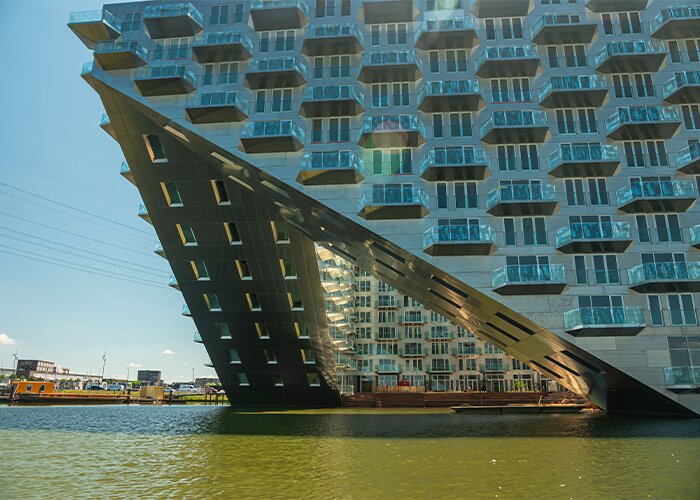 Op de plek waar stad, landelijk gebied en water elkaar ontmoeten in Amsterdam IJburg is Sluishuis gerealiseerd: het karakteristieke woningbouwproject van architectenbureaus Bjarke Ingels Group en Barcode Architects. Voor het glas viel de keuze op Thermobel iplus met een extra isolerende afstandhouder, dubbel en triple uitgevoerd. De karakteristieke over het water uitkragende gevel is voorzien van beloopbaar brandwerend glas Pyrobel EI60.