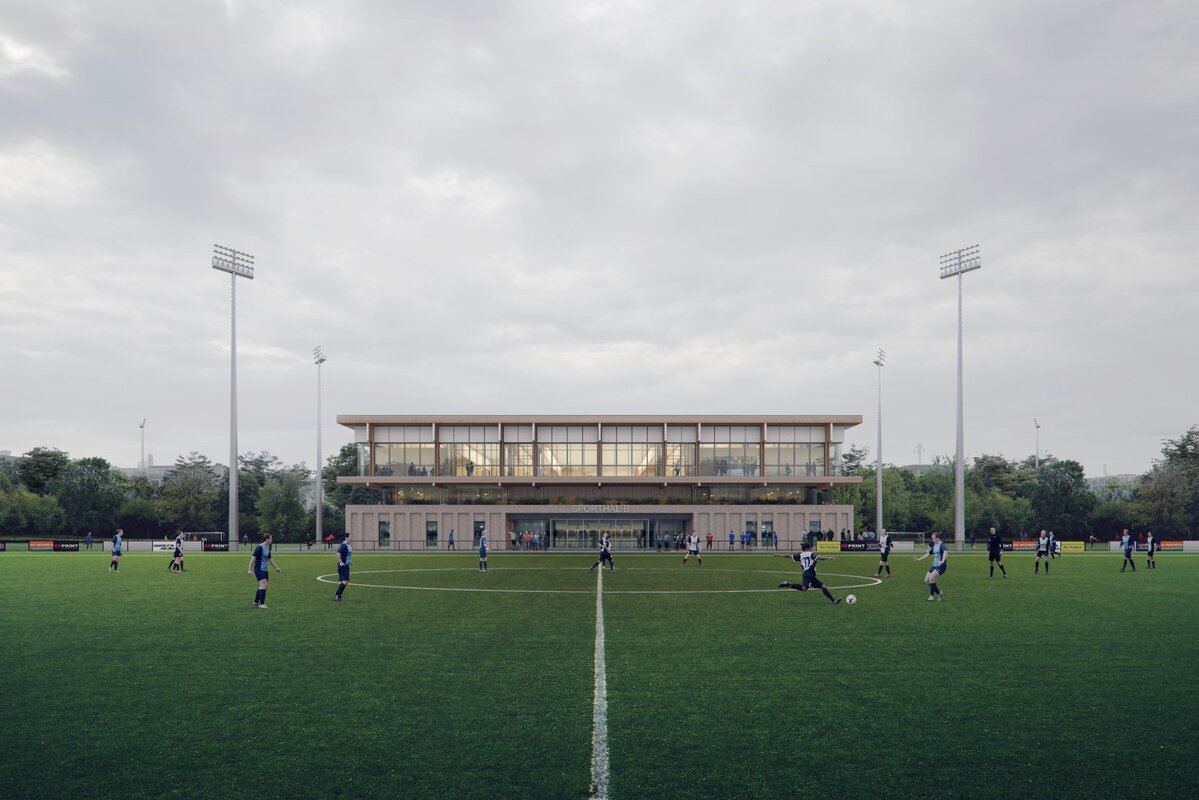 Een functionele basis met kleedkamers en voorzieningen met daar bovenop de sporthal gevormd door een demontabele houtconstructie.