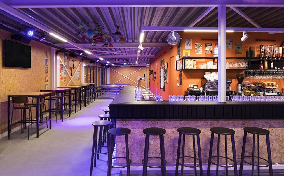 De sportkantine is georganiseerd rondom een rode facilitaire kern en opent zich letterlijk doordat houden luiken omhoog en opzij schuiven.