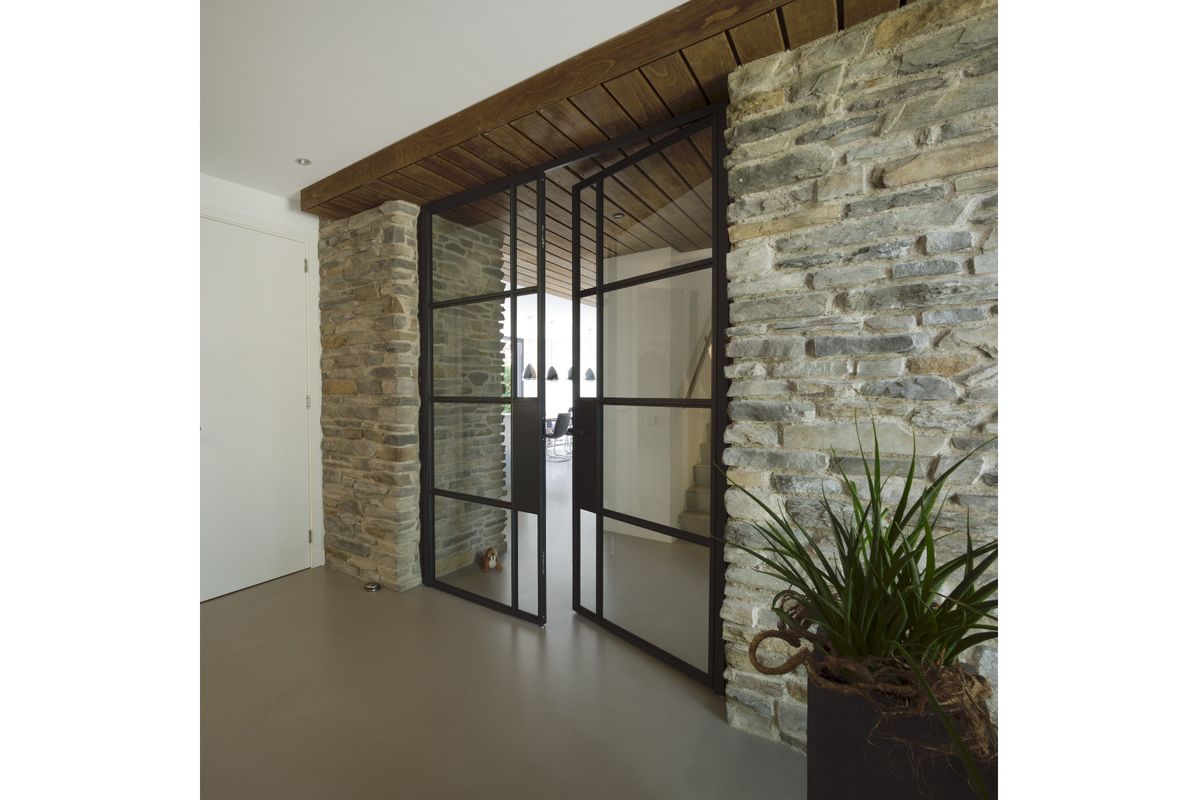vlakverdelingvan de scharnier- en schuifdeuren zijn speciaal ontworpen voor dit project. Daarnaast is de scharnierdeur bevestigd aan een robuuste stenen muur. Dit project is daarom een goed voorbeeld van de diverse mogelijkheden die wij bieden als u bij ons een