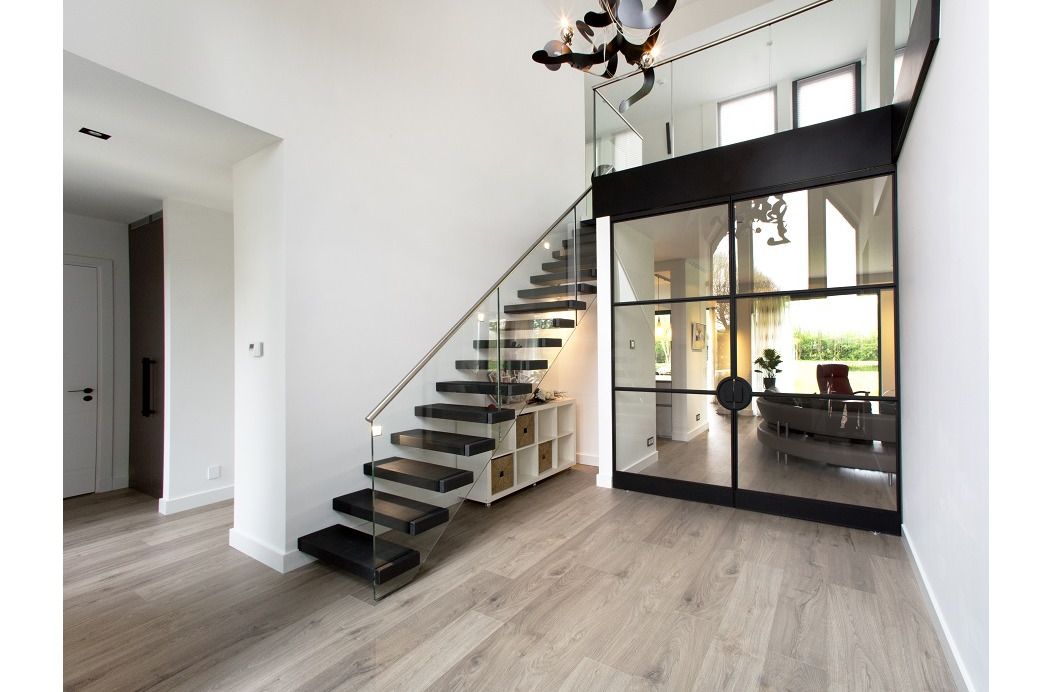 Dat onze stalen deuren zorgen voor een open karakter, bewijst dit project in Hoevelaken. Hoewel de woonkamer en de hal van elkaar worden afgesloten, zorgt de taatsdeur er toch voor dat het één geheel blijft. De dubbele taatsdeuren creëren daarnaast een prachtige lichtinval vanaf de hal naar de woonkamer. Samen met de lichte, minimalistische inrichting lijkt de woonkamer optisch groter.