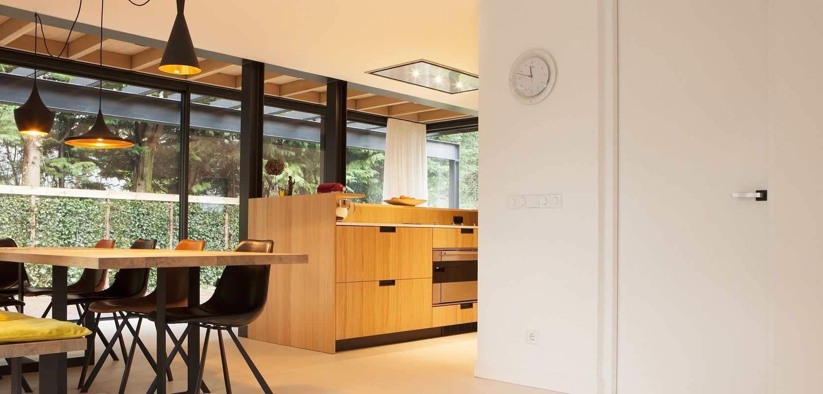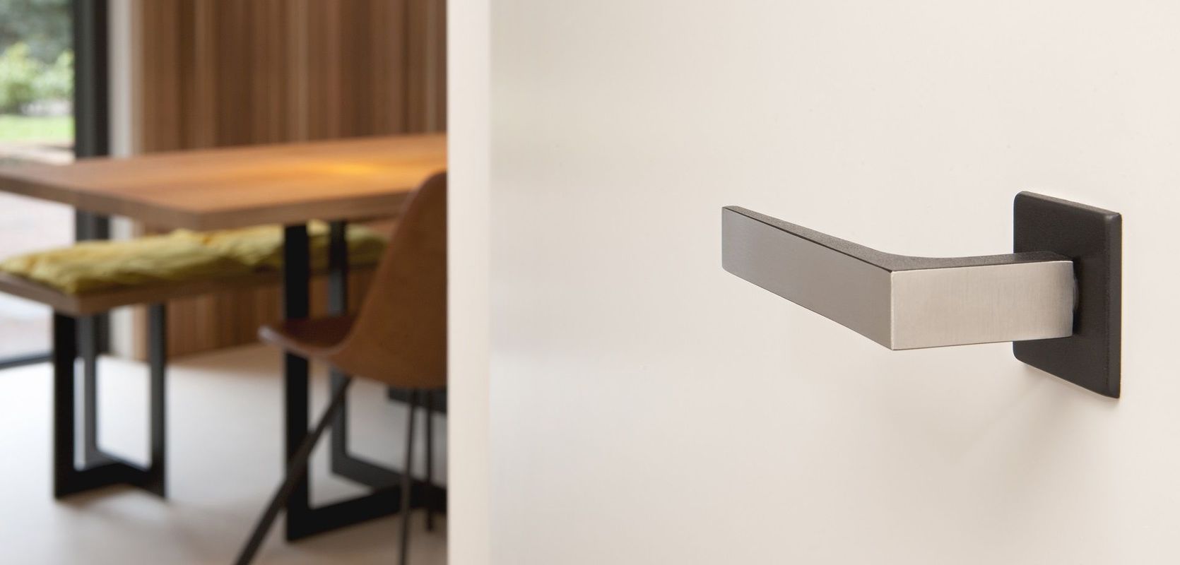 De unieke locatie gaf de doorslag bij de aankoop van een pand uit de jaren 70. Voor het moderniseren van de woning benaderden de nieuwe eigenaren John Kerssens van Kerssens De Ruiter Architecten uit Alkmaar. Hun wens: een huis met zowel binnen als buiten een stoere, eigentijdse uitstraling. Met zijn strakke, industriële vormgeving bleek het deurbeslag van Arjan Moors, ontworpen in opdracht van Intersteel, naadloos te passen in het tijdloze interieurontwerp van de architect.