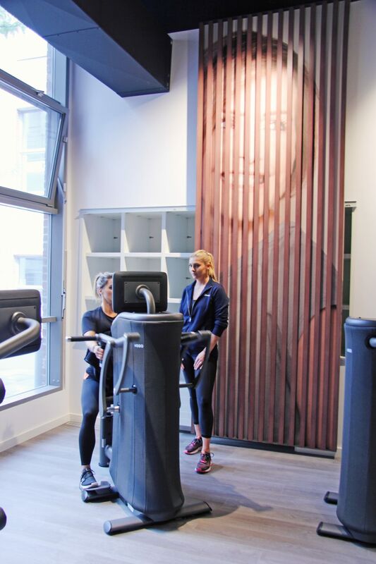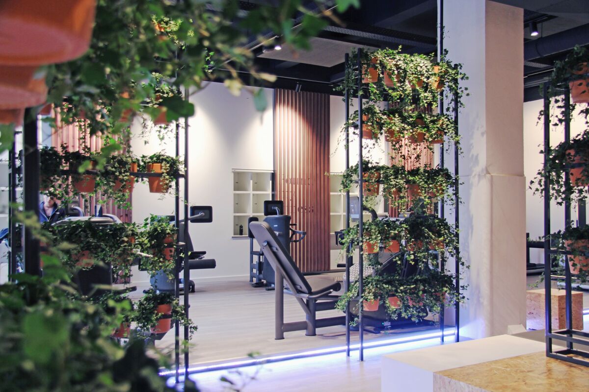 Een ander onderdeel waren de verschuifbare panelen. De look en feel van The Gym Society is warm en natuurlijk. Werken met hout is dan een erg mooie oplossing, maar ook weinig duurzaam en minder handzaam dan lichtere materialen. We ontwikkelden een verschuifbaar paneel, beplakt met een foto die past bij The Gym Society en voorzien van talloze lichtgewicht, aluminium kokers bekleed met hoge kwaliteit houtfolie waardoor de kokers niet te onderscheiden zijn van echt hout. Het effect van deze houtlook kokers voor de sprekende foto is fantastisch.
