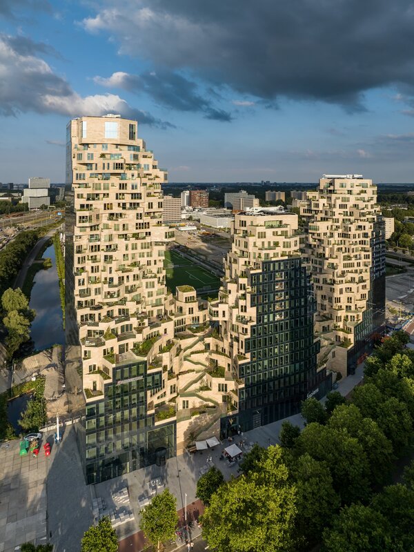 Verschillende locaties in het complex met drie torens bieden een adembenemend uitzicht over de stad - de appartementen natuurlijk, maar vooral de skybar op de top van de hoogste toren, waartoe bezoekers toegang hebben via de Molteni-flagship store op de begane grond. De indeling van het gebouw is afgestemd op een mix van bewoners, werknemers en bezoekers: bovenop de drie verdiepingen tellende ondergrondse parkeergarage bezetten de onderste zeven verdiepingen kantoren, met appartementen op de achtste verdieping en hoger. Een groot deel van het gebouw is open voor het publiek: van het openbaar toegankelijke voetpad dat vanaf straatniveau zigzaggend naar de centrale vallei kronkelt, tot de Grotto, een atrium dat een overdekte straat vormt op de eerste verdieping waar het Sapiens Lab – een broedplaats voor jonge wetenschappers – gaat binnenkort open. De grot is met de buitenkant verbonden door twee grote dakramen die ook dienst doen als ondiepe waterpoelen in het dal erboven, en de natuurstenen vloeren, muren en plafonds - dezelfde steen die wordt gebruikt op de oppervlakken van de vallei en torens - maken duidelijk dat alle openbare ruimtes van het gebouw maken deel uit van dezelfde ogenschijnlijk geologische formatie.