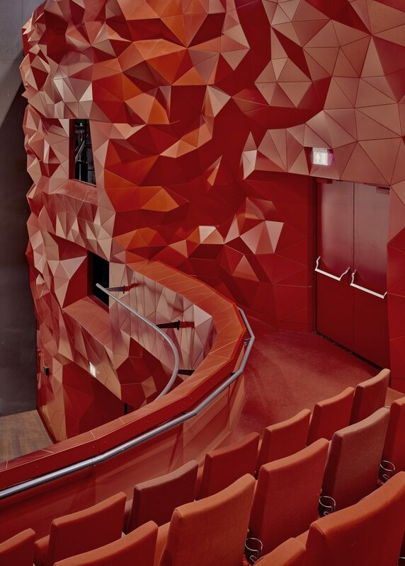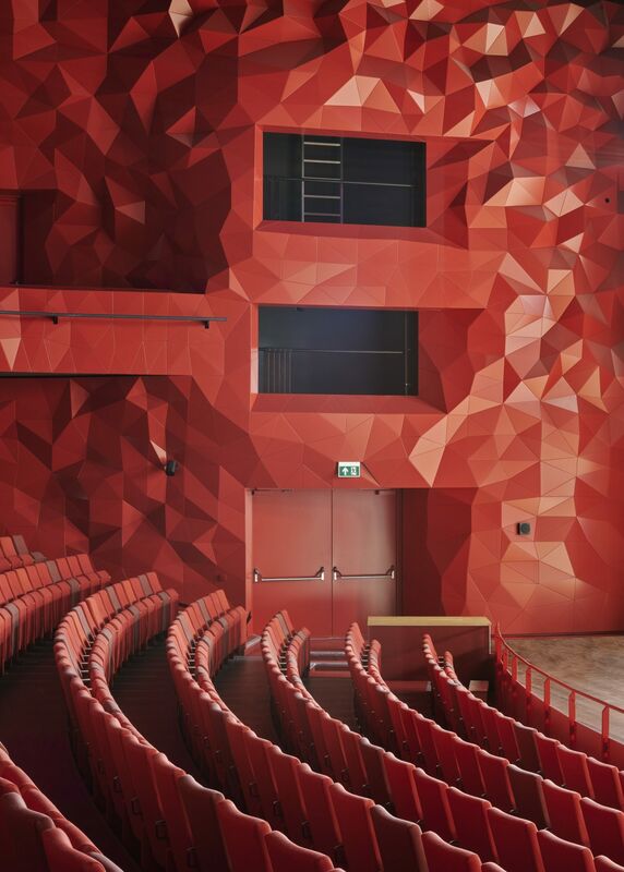 De wanden hebben geometrische vormen en tegelijkertijd een warme uitstraling. Ze zorgen voor een perfecte akoestiek, waar je je ook in de zaal bevindt.