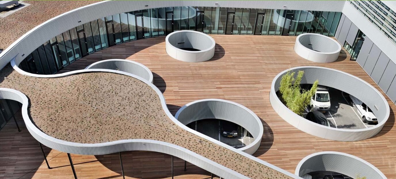 groendaksystemen. De Fixodrain XD 20 is populair vanwege zijn eenvoud en efficiëntie, en kan een hoeveelheid van 3 liter water per vierkante meter bergen. Het groendak is afgewerkt met 1200 m2 van ons kenmerkende sedumtapijt.