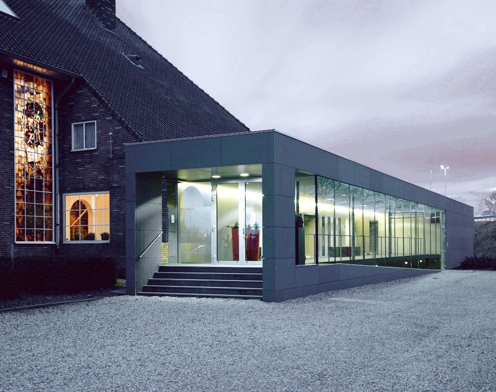 De zichtbaarheid en bereikbaarheid waren uitstekend, maar het gebouw voldeed onvoldoende aan de functie. Wij verwijderden alle in de loop der tijd aangebouwde volumes en elementen en vervingen deze door een eenduidige nieuwbouw. Met zijn natuurstenen uiterlijk onderscheidt het nieuwe gedeelte zich van de bakstenen villa. Het serene karakter van de nieuwbouw past helemaal bij het uitvaartcentrum.