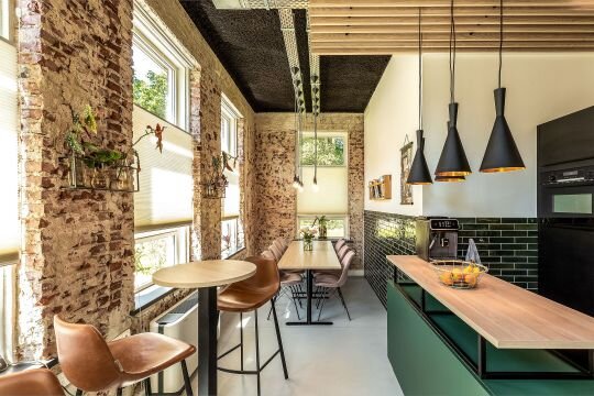 Voor de sfeer is er gekozen voor een hotel vibe: gastvrij en chic. Er zijn pastelachtige tinten toegepast, die niet helemaal doorlopen tot het plafond maar stoppen op een hoogte van 2.40. Deze hoogte komt overeen met een oorspronkelijke tegellijn, die in de gangen van de school aanwezig waren. Hierdoor krijg je een heel bijzonder effect. Verder zijn de bekende ouderwetse schoolposters als behang op een aantal wanden aangebracht.