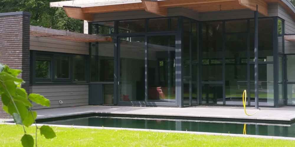Hiervoor is een eenlaagse woning ontworpen in een robuuste bruine baksteen, met een licht verhoogde woonkamer voorzien van een gebogen dak met houten liggers en daarop een sedumdak. De woonkamer en keuken voorzien van een speelse pui welke direct grenst aan het terras met zwemvijver. De woning is voorzien van permanente zonwering in de vorm van houten lamellen die de warme zomerzon weren, maar de zon in lente en herfst wel toelaten in de woning. Vanuit de eetkamer is er middels een groot panoramaraam direct zicht in het bos, een voortdurend wisselend schilderij, een cadeau van de locatie.