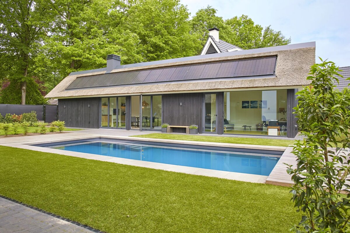 De villa en het poolhouse liggen rondom het centraal gelegen zwembad en zijn middels een houten loper met elkaar verbonden. Het exterieur van de beide gebouwen betaat uit wit stucwerk en donker gebeitst hout, afgedekt met rieten kappen. Grote glasvlakken, deels voorzien van aluminium vouw-schuifpuien, zorgen voor veel licht in het interieur en een goede verbinding met de buitenruimte. Royale vides boven de entree en de eethoek zorgen verder voor een goede verbinding met de verdieping van de villa.
