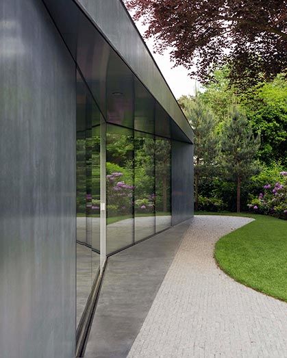 Door de verdiepingshoge glasgevel aan voor- en achterzijde is er vanuit de leefruimte een open en transparante verbinding richting voor- en achtertuin. De gevel is een semi-structurele vliesgevel blank geanodiseerd aluminium, met drievoudige beglazing en zwarte kitvoeg.