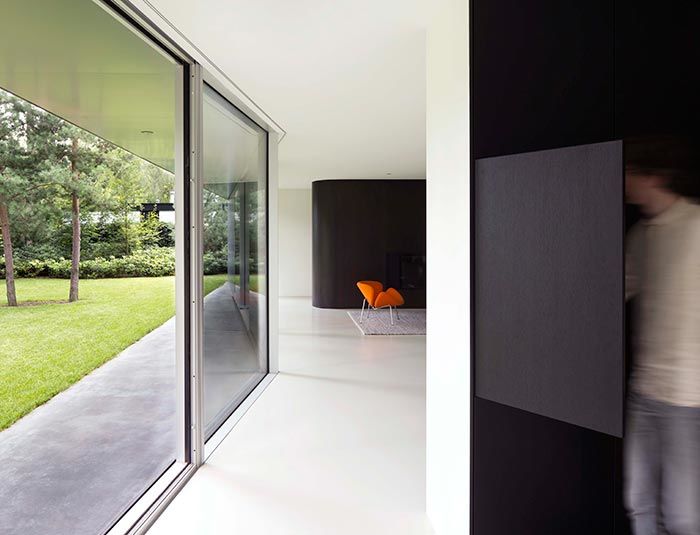 ''Villa X karakteriseert zich door een eenvoudige vorm die massief in het groen staat. Centraal in het volume is een open leefruimte uitgespaard, ingeklemd tussen zware koppen met de besloten ruimten en overspannen door een compact dak dat oogt als een baldakijn. Door de façades naar binnen te vouwen ontstaat een verrassende relatie tussen het interieur en de bosrijke omgeving. De gevels van de privévertrekken zijn uitgevoerd in antraciet beton met een glad, reflecterend oppervlakte – verkregen door meerdere malen met de hand te polijsten.”