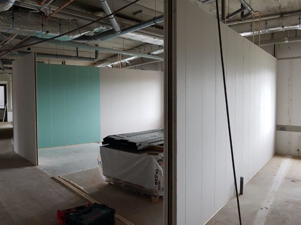 De grote kantoortuinen werden opgedeeld in appartementen met een gemiddelde oppervlakte van ca. 24 m2. Voor het scheiden van deze appartementen is uiteindelijk gekozen voor de IW148 wand van Faay. Deze woningscheidende wand is een samengestelde wand van twee VP54 panelen welke beschikken over een kern van vlasscheven gesandwiched met een gipskartonplaat met daartussen een spouw van 40 mm. De ankerloze spouw wordt gevuld met minerale wol en garandeert een optimale geluidsisolatie. Deze solide samengestelde woningscheidende wand biedt uitstekende isolatie (56 dB) en zeer hoge brandwering: 90 minuten.
