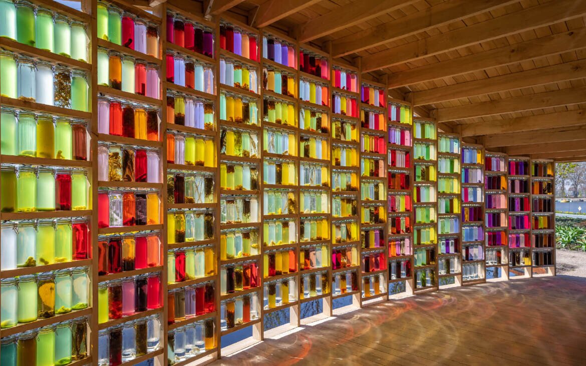 De zonnestralen die door de wand van het Wolunie-paviljoen schijnen, vormen een opvallend kleurenspel op de houten vloer: gele, oranje, groene en paarse strepen. De wand bestaat uit 750 transparante glazen flessen met daarin verschillend gekleurde vloeistoffen. De oplettende kijker zal zien dat in een aantal flessen ook gebreide mini-schaapjes zitten. “Sommige mensen vinden het er een beetje raar uitzien, alsof het embryo’s zijn”, zegt textielkunstenaar Bertina Slettenhaar lachend. In samenwerking met de Almeerse Wol-unie wilde Slettenhaar mensen ervan bewust maken dat je textiel ook op een duurzame, niet-chemische manier kunt kleuren. “Met de flessenwand laat ik een kleurenexplosie zien en daarmee de kracht van de planten.” De Wolunie kleurt wol met kleurstoffen die worden gemaakt uit planten van de eigen verfplanten-akker. Op deze akker, 800 vierkante meter groot, groeien verschillende bloemen. “Zo gebruiken we de plantensoort de wouw om de kleur geel te maken. Voor blauw gebruiken we wede. “Bij het kleuren van wol met natuurlijke kleurstof wordt de wol meestal samen met de kleurstof verhit: na een uur is de kleur dan ingetrokken. Bij dit ‘sun dye’ proces duurt het wat langer. De zonnestralen die door de flessen schijnen, creëren warmte, die ervoor zorgt dat de kleurstof de wol intrekt. Dit proces duurt ongeveer een maand. De kleur beklijft beter naarmate de wol er langer in zit”, legt Slettenhaar uit. “Nu de zonkracht nog niet op volle sterkte is, laten we de wol gewoon tot het einde van de Floriade in de flessen zitten. Een ding is zeker: er gaat een witte kudde schaapjes in en een komt een gekleurde kudde uit.”
