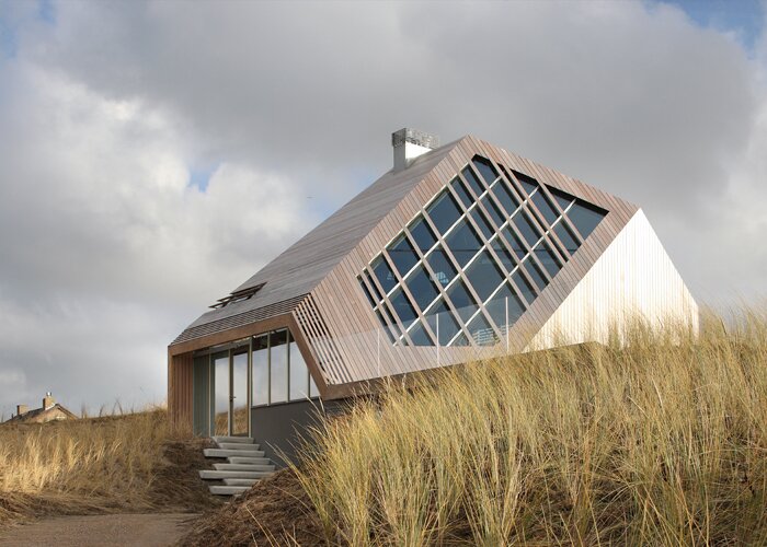 AchterboschZantman architecten heeft de engineering gedaan tot aan de uitvoering. Het zomerhuis ligt half ingegraven in de duinen. De diamantachtige homogene sculptuur heeft een ideale oriëntatie op de zon, wind, uitzicht en privacy. Zowel dak als gevels zijn bekleed met planken die overal naadloos de hoek om lijken te zijn gevouwen. Het onbehandelde red cedar vergrijst waardoor het vrijwel dezelfde kleur aanneemt als het omliggende duinlandschap. Het verandert net als de natuur met de seizoenen mee. Het volume is dus in meerdere opzichten ingebed in de duinen.
