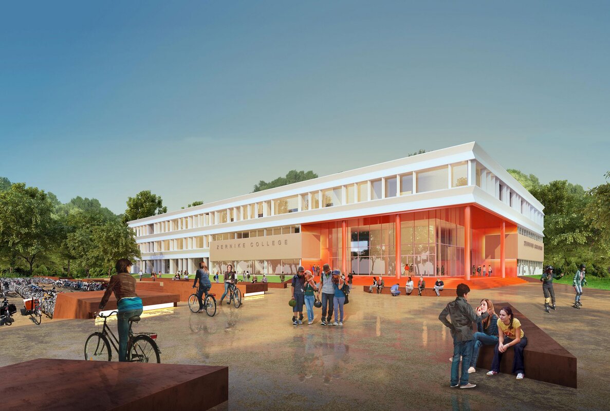 De uitvraag voor de selectie betrof het programma van eisen voor de bovenbouw van de HAVO en VWO afdelingen. Samen met een specifieke Montessori en Technasium afdeling en een sportafdeling completeren ze het programma. De circa 1400 leerlingen zullen in een gebouw van ongeveer 8000m2 het nieuwe onderwijs gaan volgen. Volgens de stedenbouwkundige opzet van Mathijs Dijkstra is het gebouwvolume in 3 lagen opgezet waarbij een centrale kantine met voordracht mogelijkheden over twee verdiepingen het belangrijkste focuspunt is. Via een grote centrale hal wordt het gebouw ontsloten. Direct vanaf de entree is er zicht in en door de kantine en zijn ook de gebruikers van de tweede bouwlaag, het Montessori onderwijs, zichtbaar. Achter de grote tribune zijn in een strategische maar rustige hoek de werkplekken voor de docenten ondergebracht. Aan het ontsluitingsplein ligt aan de noordwest hoek het Technasium met een eigen onderwijsplein. Achter het podium liggen de kunst en cultuur gerelateerde vaklokalen zodat het podium meervoudig gebruikt kan worden. De grote sportzaal hebben we op de zuidoost hoek gepositioneerd zodat er met name een goede relatie met het atrium ontstaat en er in de avonduren een optimale eigen ontsluiting mogelijk is. De tweede bouwlaag heeft een ingebouwde mogelijkheid tot uitbreiding van circa 6 lokalen. Ook kan de infrastructuur naar behoeven worden aangepast. De onderwijsclusters hebben een eigen doeltreffende opzet. Een duidelijk herkenbare eigen ‘voordeur’ (het domein is zichtbaar) met in het entree gebied altijd dezelfde voorzieningen als sanitair, lockers, concentratiewerkplekken en de kantoren van de teamleiders. De specifieke lokalen zijn als een kraag om de onderwijspleinen gedrapeerd. Op de bovenste bouwlaag, die via een vide met een brede trap met de middelste bouwlaag verbonden is, worden het HAVO en VWO onderwijs gehuisvest. Dit zijn twee onderwijsclusters die met de eigen onderwijspleinen tegen elkaar aan liggen waardoor er eigenlijk sprake is van een freeflow onderwijsvloer van circa 2500 m2. Ons ontwerp is te kenschetsen als een efficiënte opzet door een ontkoppeling van de draagstructuur van het inbouwpakket. De constructieve opzet is zeer doeltreffend en laat de gebruiker alle ruimte om op korte en lange termijn de plattegronden aan te passen aan het meest optimale onderwijskundige systeem. De ontwerpfase waarin we nu komen zal kort maar hevig zijn. Enerzijds gaan we met gebruikers alle vertrekken, relaties en nieuwste inzichten nader beschouwen en anderzijds gaan we met de specialisten van ingenieurs bureau Wassenaar (constructies) en adviesbureau Van der Weele (klimaatspecialisten) de hoofdopzet nader uitwerken. De gemeente Haren heeft samen met de adviseurs van Draaijer en Partners gekozen voor een realisatie van dit ontwerp via een DBMO constructie. In augustus 2015 moet de school operationeel zijn; voorwaar een mooie opgave in deze tijd van recessie!