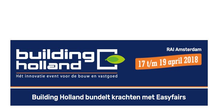 Building Holland is het 3-daagse innovatie-event voor de bouw- en vastgoedsector. Dit jaarlijkse event vindt plaats in RAI Amsterdam, met gemiddeld 15.000 bezoekers en 230 exposanten verdeeld over 15.000 vierkante meter beursvloer. Building Holland begint uit te groeien tot Europese hotspot voor de bouw- en vastgoedsector. In 2018 bouwt Building Holland het internationale karakter verder uit zodat alle partijen met internationale ambities hun toekomstige businesspartners kunnen ontmoeten. De 2018-editie vindt plaats van 17 tot en met 19 april in RAI Amsterdam. Meer informatie en gratis toegang is te verkrijgen via www.buildingholland.nl