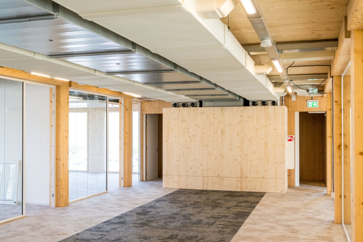Het kantoorpand is volledig opgebouwd uit Cross Laminated Timber (CLT) voor vloeren en wanden, terwijl de kolommen en liggers van gelamineerd hout (Glulam) zijn. Dit zorgt niet alleen voor een sterke constructie, maar ten opzichte van traditionele bouwmethoden ook voor een aanzienlijke reductie in CO₂-uitstoot. Bovendien zijn alle verbindingen demontabel, zodat het gebouw in de toekomst eenvoudig aangepast of zelfs verplaatst kan worden.