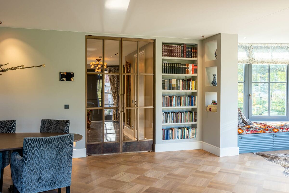 Schuifdeuren staan bekend om hun ruimtebesparende eigenschappen, maar kunnen ook zeker een uniek stijlelement zijn. Dit is wel te zien in deze prachtige woning. Op deze deuren hebben we net als bij de taatsdeuren de onderste rand voorzien van leer. Ze sluiten schitterend aan op de rest van het interieur en hebben esthetische waarde. Ook zijn de deuren functioneel, zo kunt u zelf beslissen of u de deuren beide of enkel open wilt hebben. Ontdek hier meer voordelen van schuifdeuren.