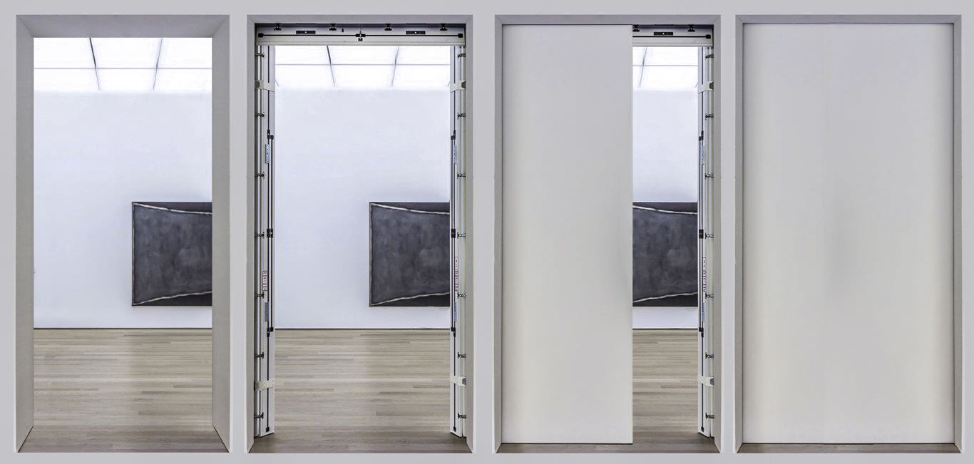 ‘Onze oplossingen zijn op veel verschillende plekken terug te vinden, waaronder in Museum Voorlinden. Anderhalf jaar voor de start van het project zaten wij al met de architect enopdrachtgever om tafel. Dat stelde ons in staat de perfecte oplossing te leveren. In de juiste afmetingen, uitgerust met de juiste afwerking en de gewenste toepassingsmogelijkheden. Door gebruik te maken van de tijd vóór realisatie was er ruimte voor modificaties en het testen van de producten en zijn we tot het mooiste eindresultaat gekomen. De vijf meter hoge brandwerende schuifdeuren zijn gemaakt van staal en volledig gestuukt. Het stelt het museum in staat een expositie op te bouwen in een afgesloten gedeelte, zonder dat er afbreuk wordt gedaan aan de esthetiek van de ruimtes. Dankzij het kleppensysteem kunnen de deuren ook volledig worden weggeschoven wanneer een expositie daarom vraagt. Een ander aspect wat hier speelde was de inbraakwerendheid. Om collecties binnen te halen, moet worden voldaan aan een hoge mate van inbraakpreventie. Onze schuifdeuren leveren hier een significante bijdrage aan. Het sluitstuk van dit uitdagende project was de wens inzake de besturingstechniek. Deze moest -uit het zicht- in een andere ruimte worden geplaatst. En zo geschiedde.’