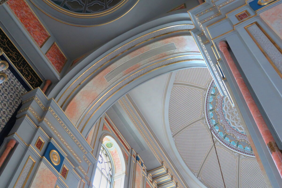 De volledige bouw van de moskee duurde overigens, inclusief een vertraging, zo’n vier jaar. De plafondschilderingen en kalligrafische elementen zijn met de hand aangebracht en kostte ruim duizend manuren.