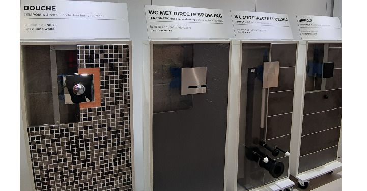 Een gedeelte van de stand was gewijd aan de nieuwe inbouwoplossingen voor urinoirspoelingen, toiletspoelingen en douches. Bezoekers ontdekten graag hoe de door DELABIE ontwikkelde inbouwmodules aangepast kunnen worden aan verschillende wanddiktes en verschillende installatieopties.