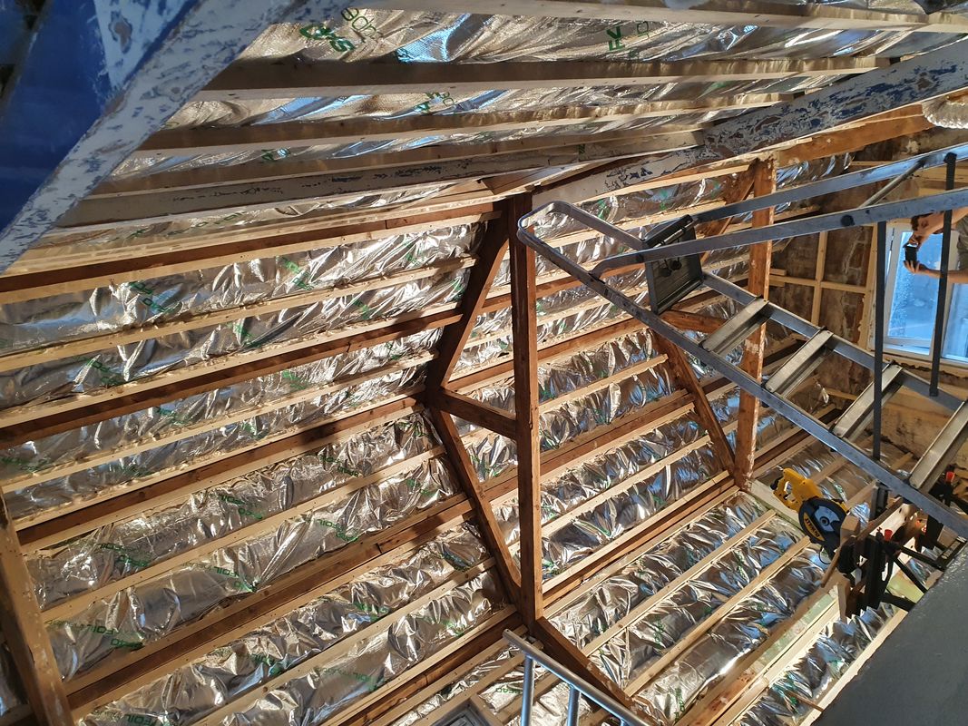 Dit hebben we gerealiseerd door de prachtige kapconstructie van binnenuit te isoleren met een effectieve combinatie van SF40, SF60 en SFTV. Er wordt zo een Rc-waarde van bijna 7 m2*K/W gerealiseerd met behoud van authentieke spanten in het zicht. Zonder gasverbruik kan men hier straks genieten van een authentieke, onder architectuur gebouwde woning van bijna 100 jaar oud, met al het comfort en woongenot van nu.