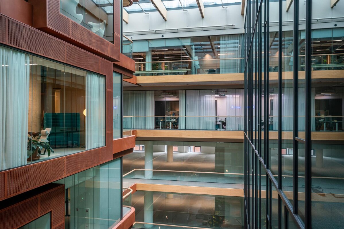 Voor de architect was transparantie cruciaal. Geen zware profielen, maar ranke lijnen die de architectuur versterken. Wat je ziet is puur glas. De kantoren en vides lijken te zweven wat het gebouw zijn elegantie en openheid geeft. Het atrium is bijna een explosie van daglicht met overal glazen gevels die tegelijk krachtig en verfijnd zijn. De technische uitdaging zat niet alleen in het glas zelf, maar ook in de aansluitingen: het gebouw beweegt, het glas niet. Die spanning moet subtiel worden opgevangen in de constructie, onzichtbaar voor de gebruiker.
