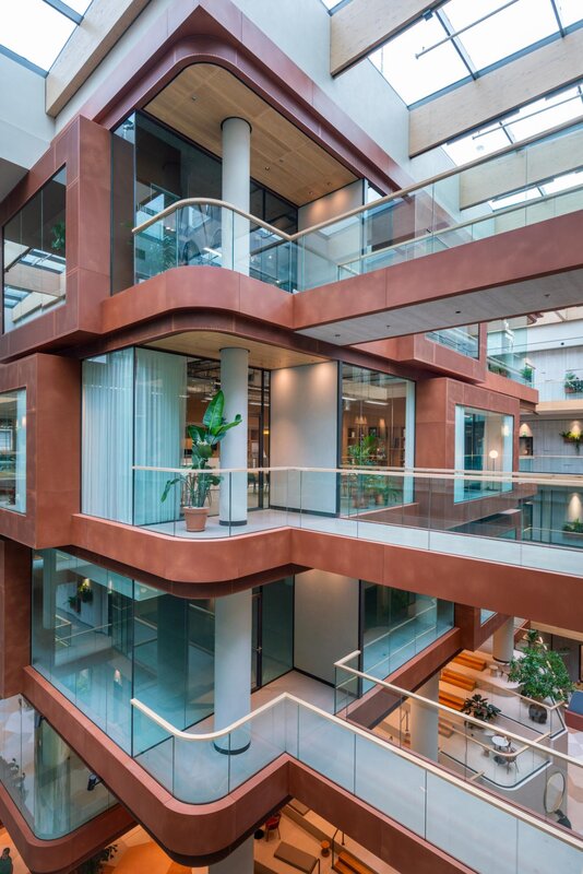 Je kunt er niet omheen: glas heeft een hoofdrol in deze herontwikkeling en zorgt voor een spectaculaire binnenplaats die daglicht diep in het gebouw laat binnendringen. De kantoren konden niet achterblijven en zijn stuk voor stuk high-end: ruim, licht en verrassend in hun gelaagdheid. ’Vanuit de plint kom je binnen via een custom made spiraaltrap met eiken treden en ook weer de cortenstaal-look die we ontwikkeld hebben. Vervolgens stap je door een bescheiden entree en sta je plots in een immense open ruimte. Het contrast is zonder meer verrassend en spectaculair.’