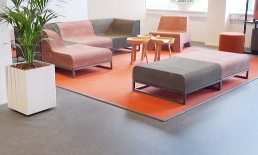 In het gebouw van de faculteit EWI ligt inmiddels nieuw Marmoleum. Daarop staat ‘oud Marmoleum’ in de vorm van zacht zitmeubilair met een coating, gemaakt van Marmoleum afval.