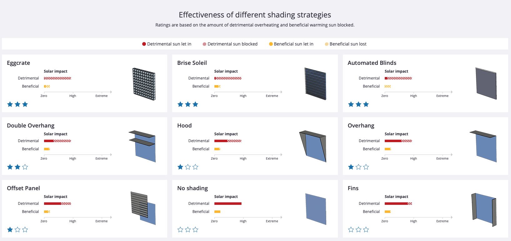 Vervolgens krijgt men een aantal strategieën voor zonwering met elk hun eigen resultaat. “De optie ‘Eggcrate’ (zonwering in matrixvorm) zorgt er bijvoorbeeld voor dat de schadelijke zon in de zomer wordt buiten gehouden. Echter houdt het in de winter ook nagenoeg alle gewenste zon tegen. Bij de optie ‘Brise Soleil’ (horizontale zonwering) is de impact van de schadelijke zon al nagenoeg verdwenen en behouden we in de wintermaanden toch het voordeel van het zonlicht dat het kantoor van wat extra comfort voorziet.”, aldus Kraan.