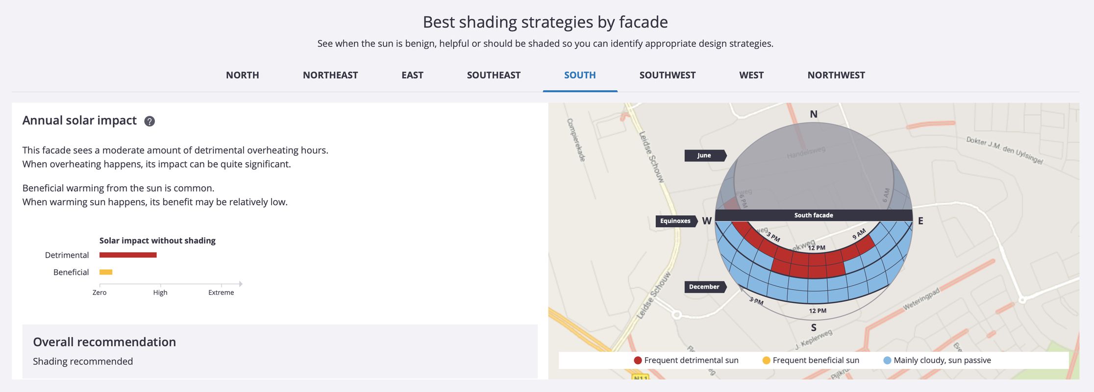 “Voor ons was in dit geval het onderdeel Shading (zonwering) heel belangrijk, omdat de zon in dit geval de oorzaak van het probleem is. Bij de analyse van de impact van de zon zag ik dan ook gelijk heel veel rood aan de zuidzijde van ons gebouw. Dat noemen ze in PreDesign de ‘Frequent detrimental sun’ (frequent schadelijke zon) en daar word je als architect eigenlijk niet blij van. Zeker als je ziet dat de ‘Beneficial sun’ (de zon die zorgt voor wat extra thermisch comfort) in verhouding dan erg laag is. Dat is namelijk het zonlicht waar je iets aan hebt in de donkere maanden van het jaar.”