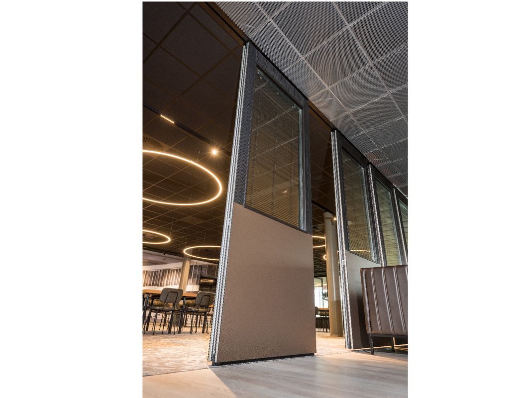 De paneelwanden hebben een hoogte van 3 meter en scheiden de multifunctionele ruimte over een lengte van 18 meter. De wanden zijn uitgerust met een bronskleurige lambrisering en bevatten aan de bovenzijde een groot geluidsisolerend glasoppervlak met minimale profilering. De jaloezieën aan de zijde van het vergadergedeelte bepalen de mate van transparantie. De geluidsisolerende deuren zijn links en rechts verwerkt in een vaste wand waarachter de panelen opgeborgen kunnen worden. In geopende stand zijn de geparkeerde panelen dus volledig aan het zicht onttrokken.